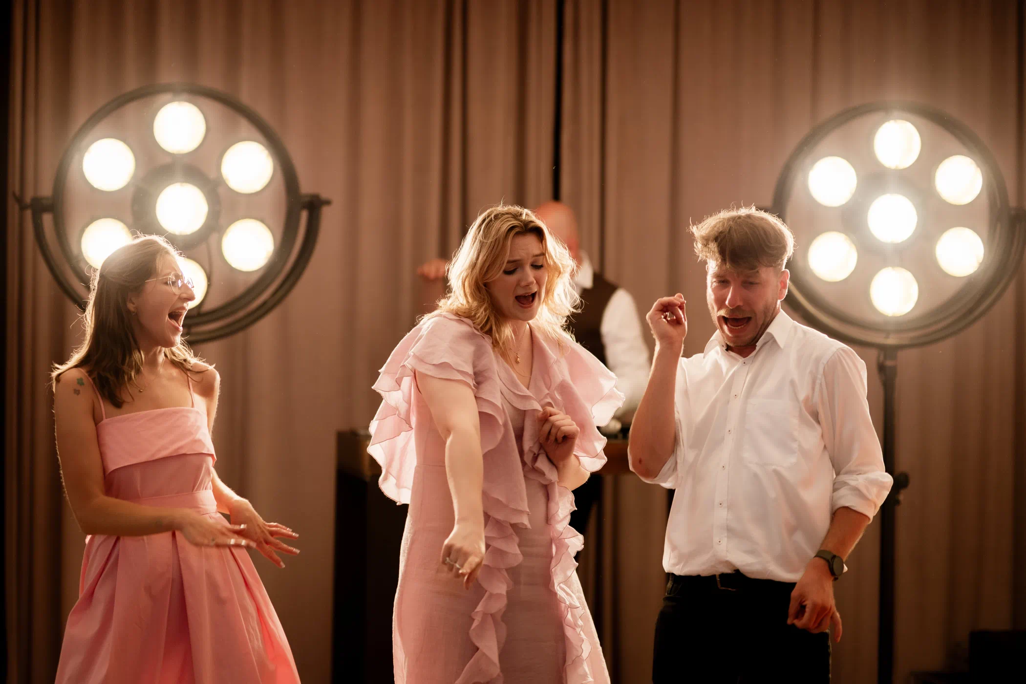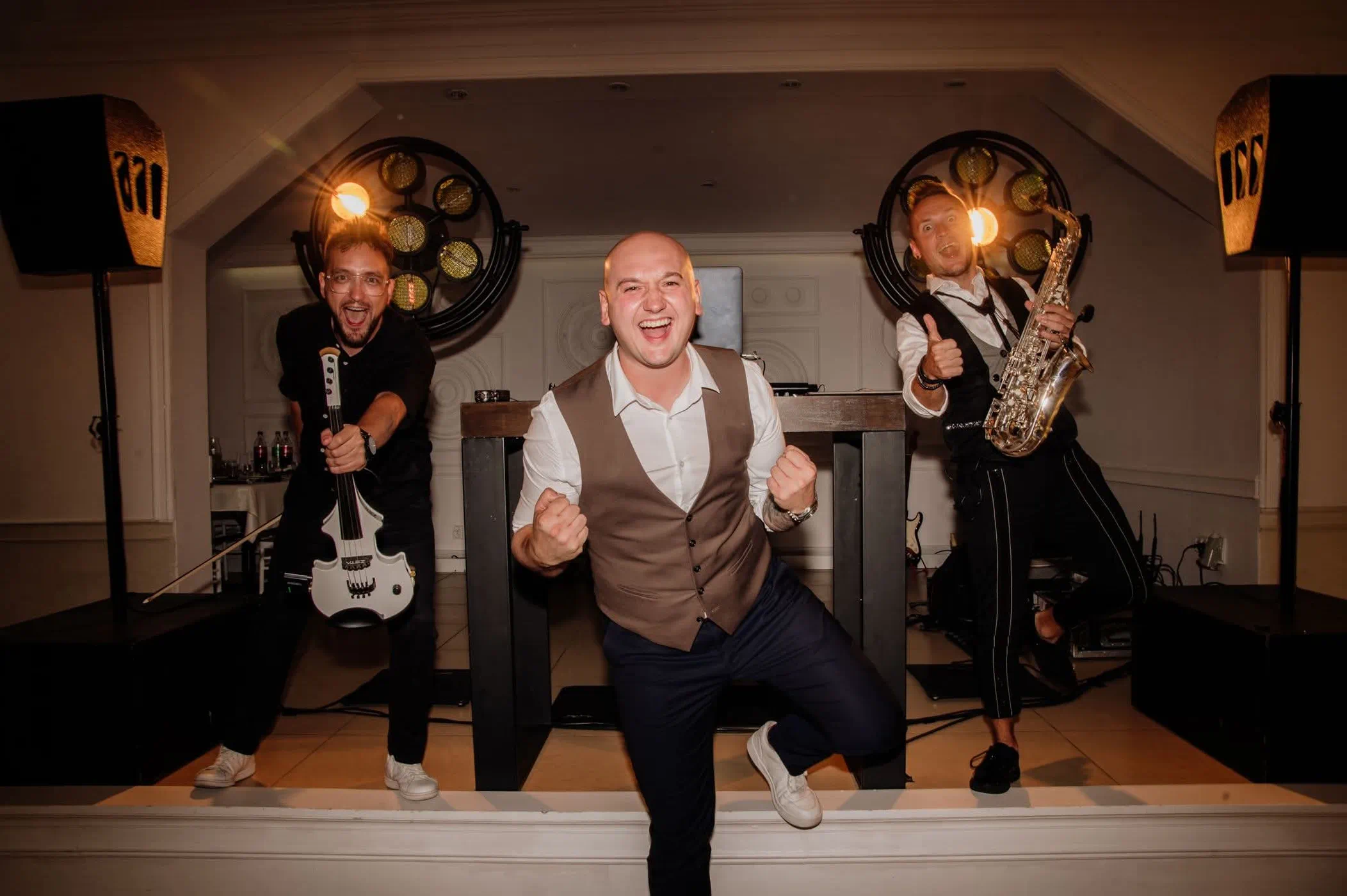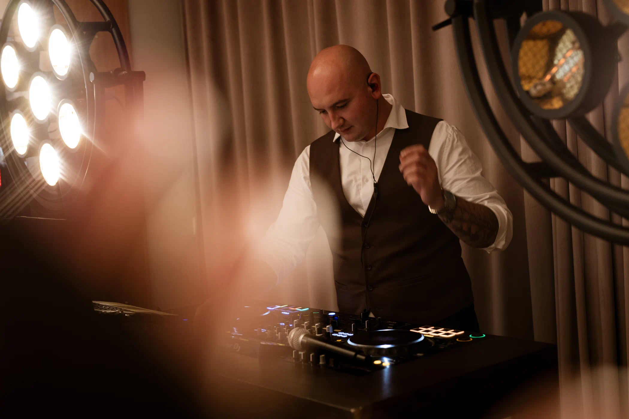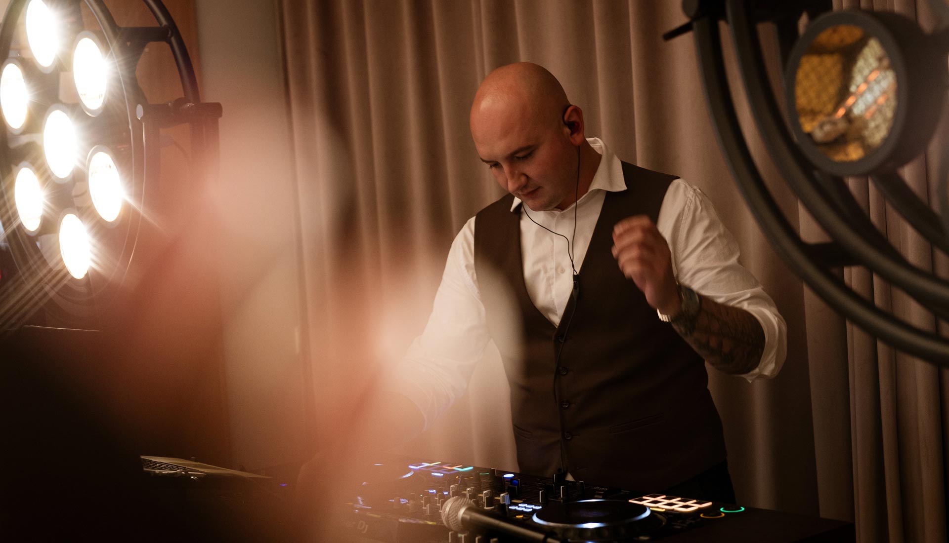 Sprzęt na którym pracuję to zestaw najwyżej klasy nagłośnienia połączony z oświetleniem żarowym. Ciepłe białe światło wygląda zdecydowanie lepiej niż kolorze kropki na twarzach gości. Całość prezentuje się bardzo elegancko i stylowo. Nie znajdziecie tam wiszących kabli i wielkiego logo DJ’a.